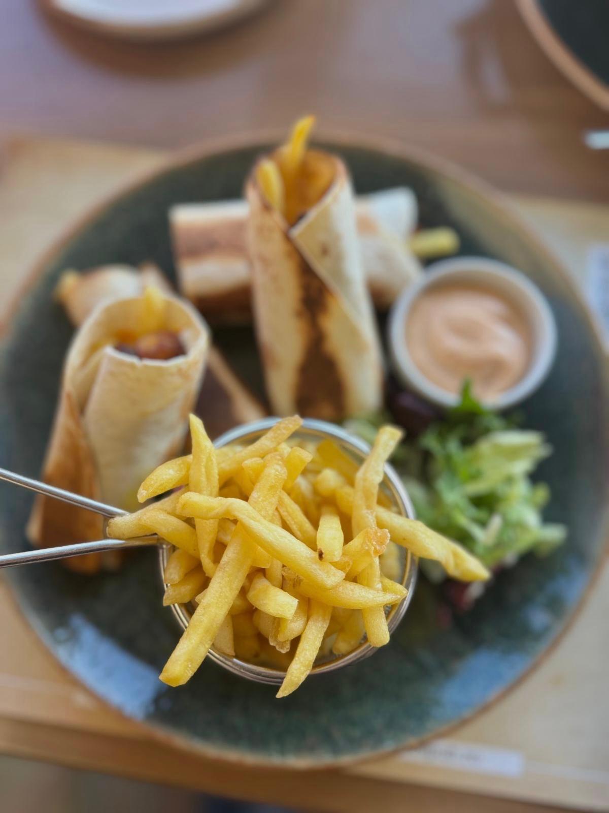 Gyros de pui, cașcaval, cheddar, castravete murat, cartofi pai, sos usturoi, lipie Valori nutriționale: Calorii 1048 kcal, Carbohidrati 84g, Proteine 28g, Grasimi 64g, Sare 3g, Zahar 7g Alergeni : gluten, lactoză